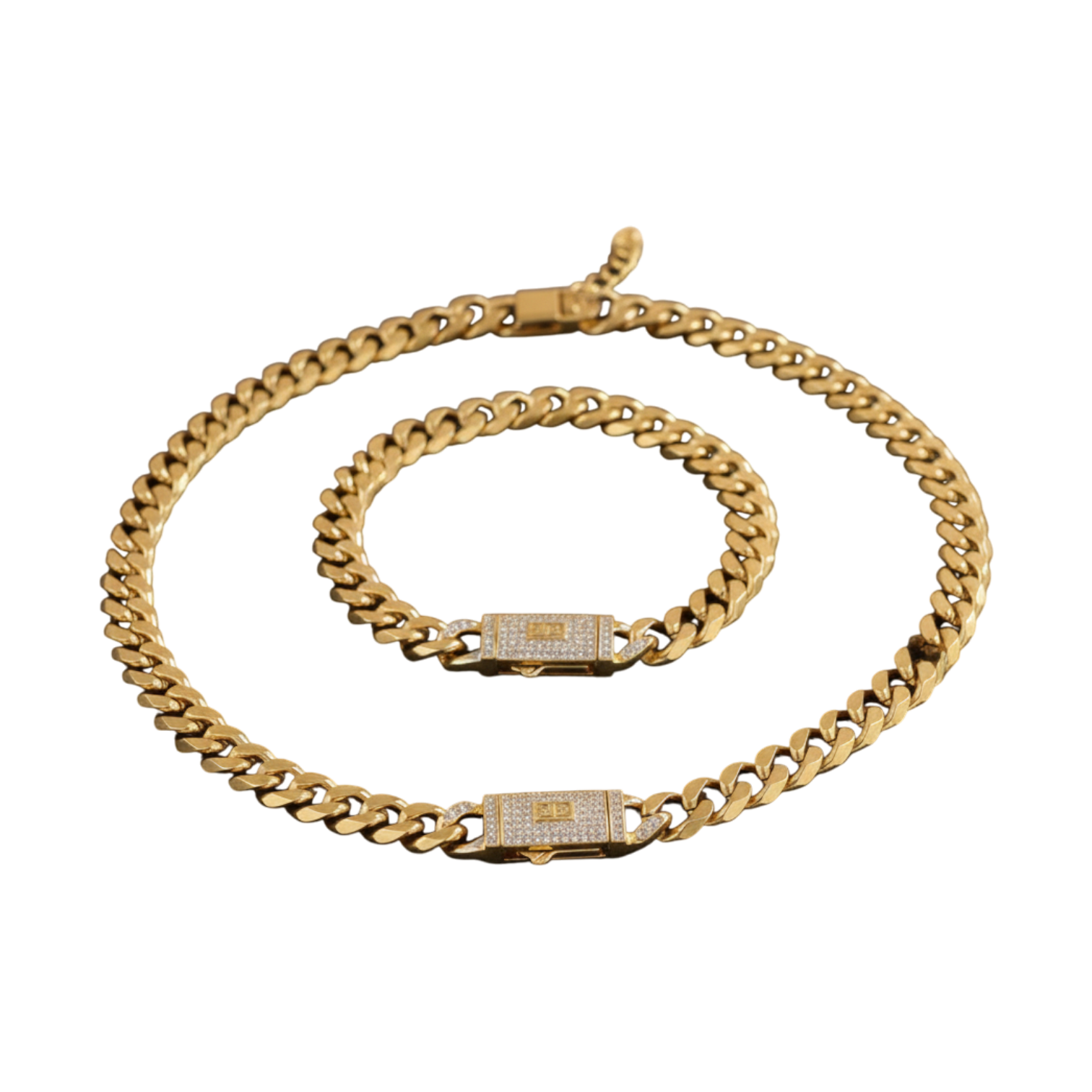 The Royal Cuban Link set showcases a bold and luxurious design inspired by classic Cuban links. With its polished finish and strong, structured silhouette, this set delivers a powerful statement of elegance and confidence. Perfect for special occasions or elevated everyday looks, it adds a rich, royal touch to any outfit.