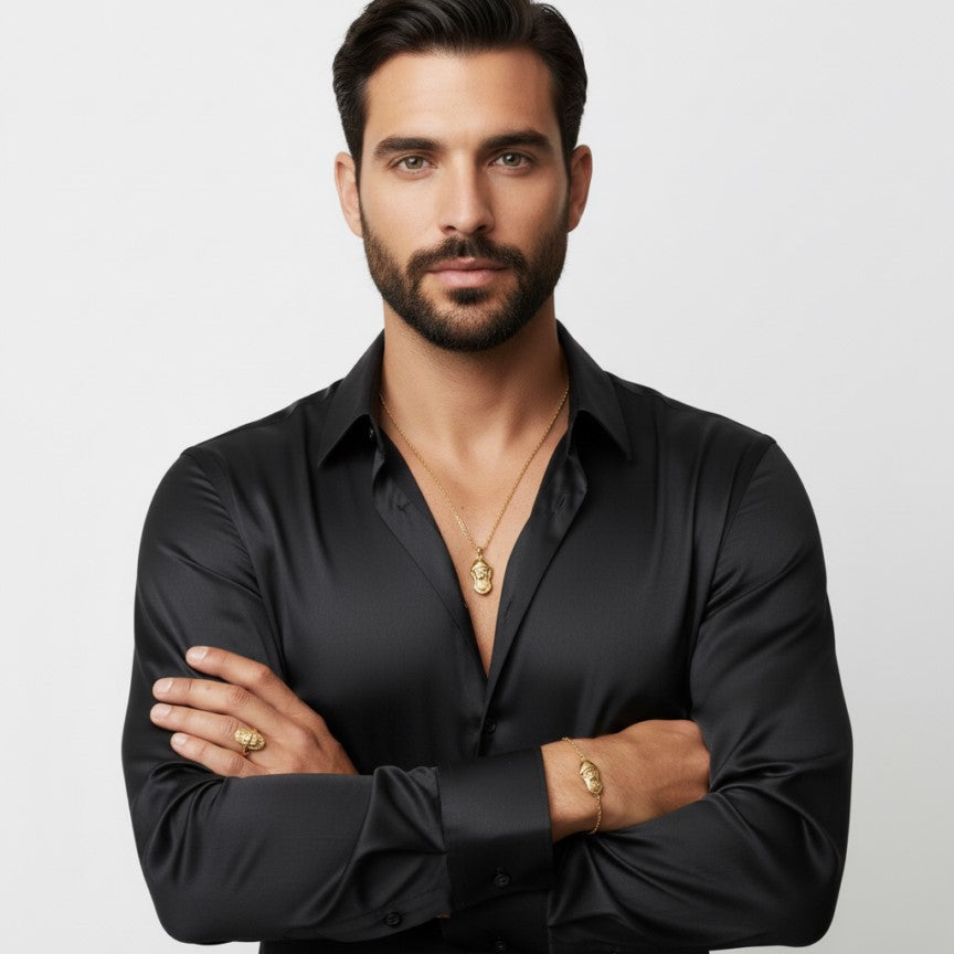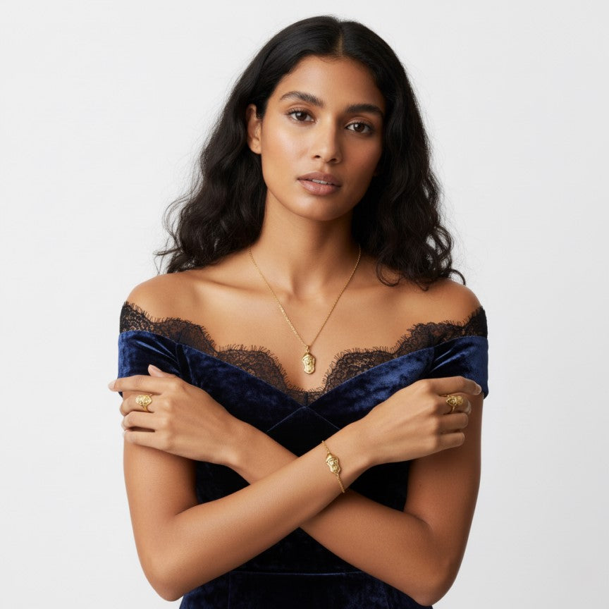A beautiful gold-plated religious jewelry set featuring a finely detailed Saint Charbel pendant. The set includes a matching necklace, bracelet, and ring, perfect for expressing your devotion or gifting to loved ones. Symbolizes faith, protection, and blessings.